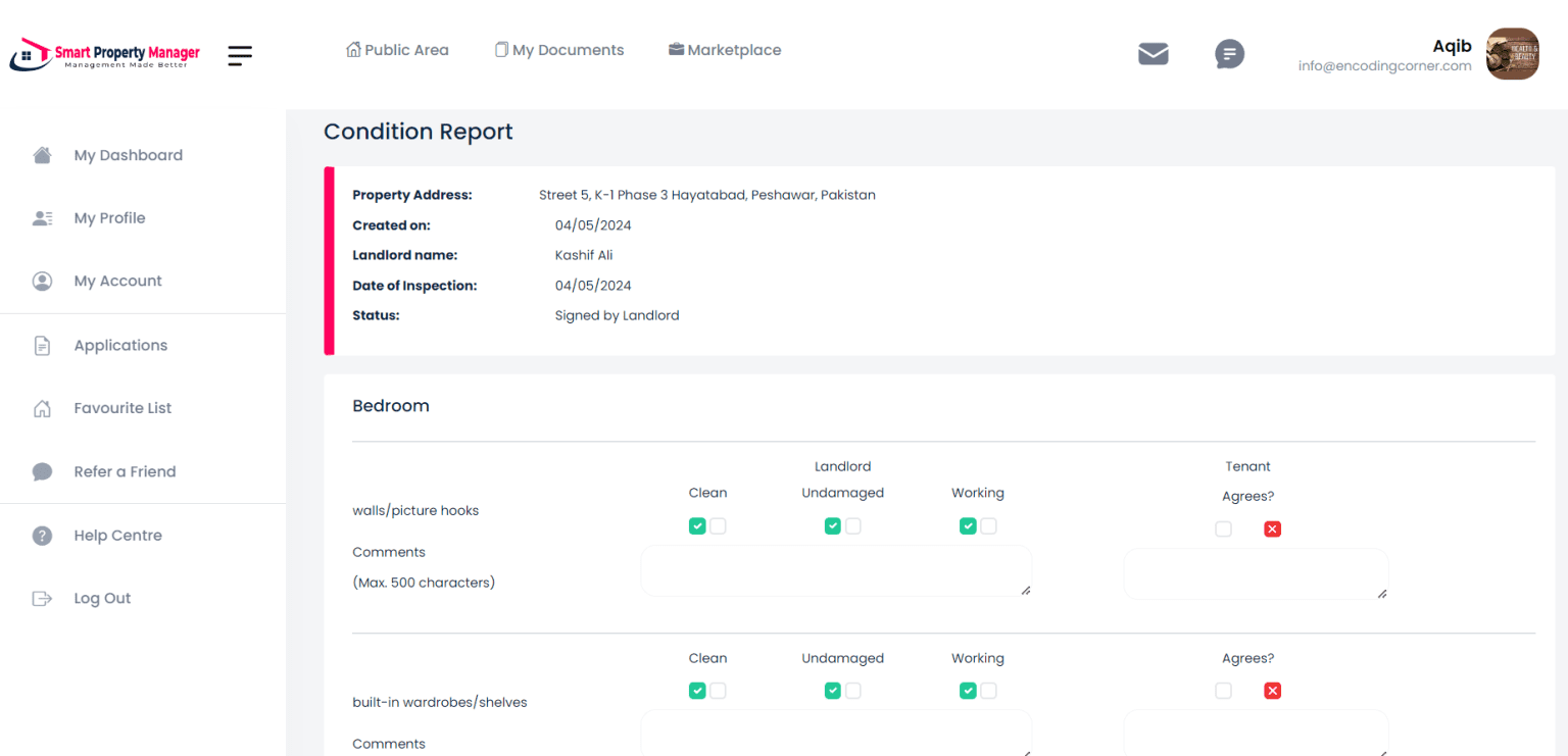 This application is a real estate management & advertisement platform build for both landlords and tenants. A landlord can advertise their property after registering with the application. A landlord can log in to their account to access the dashboard where they can create a new property, create an advertisement. They can also create a lease, condition report, view enquiries, add expense or maintenance bills, chat with tenants, add maintenance record, view and approve or reject tenancy applications. The landlord user can also edit their profile and view different documents like lease agreement and condition report. A tenant user can log in to sign their lease agreement, view and agree or disagree with condition report and sign it. The tenant can also make rental and bill payments and can chat with the landlord. The tenant can view property listings, favouritise them and apply for tenancy. They can also create and update their tenancy profile and view documents like lease agreement, condition report etc. The landlord sets-up lease and sends to tenant which signs it and sends back to the landlord which signs and the lease agreement is generated and saved by system which both landlord and tenant can accesss in their repective dashboards in ‘My Documents’ section. The landlord creates a condition report document current condition of different areas of a property and sends it to the tenant who agrees or disagrees with landlord statements and entries, signs the document and sends back to landlord. The landlord signs the document which is saved in the saved for later reference. Both landlord and tenant can access the document in their respective ‘My Document’ section.